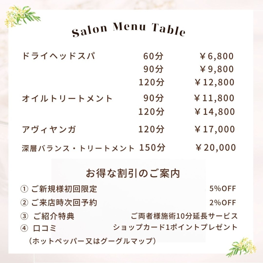 ヒアリング内容から今あなたに必要な3つの癒しを組み合わせてご提案します。ご予約時は施術時間のみをお選びください。