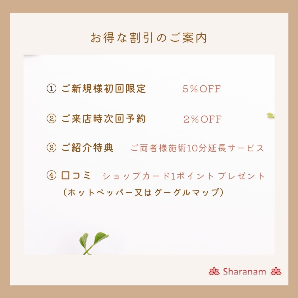 3つの癒しをとことん満喫スペシャルコース《こんな方にオススメ!》・とにかく眠りたい・眼精疲労、緊張性頭痛が辛い・足がパンパン、浮腫みやすい・2回目以降の一点集中コリほぐしを念入りに受けたい※初回は90分コースをオススメします。《施術内容》・ヘッド/首/肩/肩甲骨周りほぐし・オイルハンドトリートメント・一点集中コリほぐし